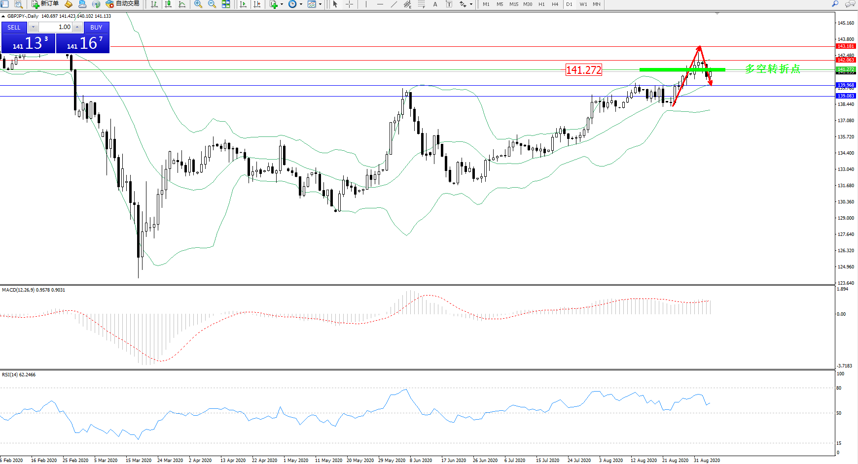 备选策略:141.272上方看涨,目标142.063、143.181