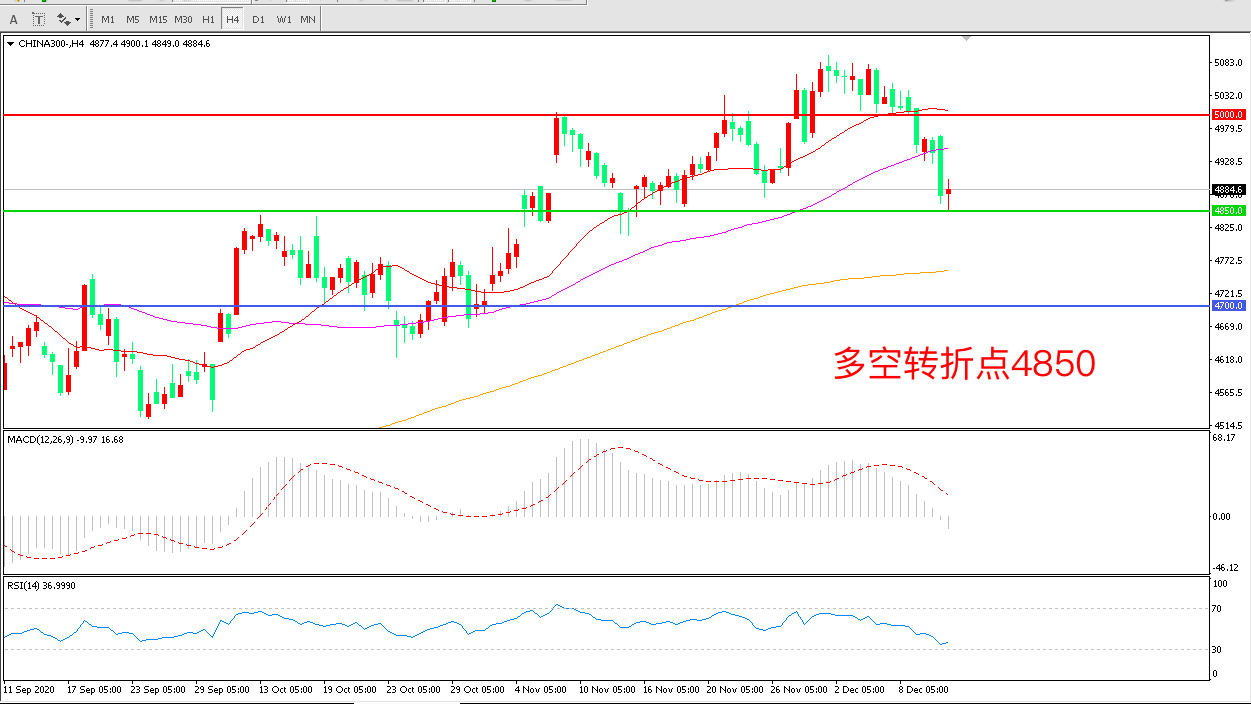 4小时图看,沪深300高位震荡后大幅下挫,短期表现低迷,4850成为短线支撑,55周期均线成为上方阻力,均线系统走平,MACD红柱减少,绿柱增加,RSI指标向上,日内延续震荡概率较大。