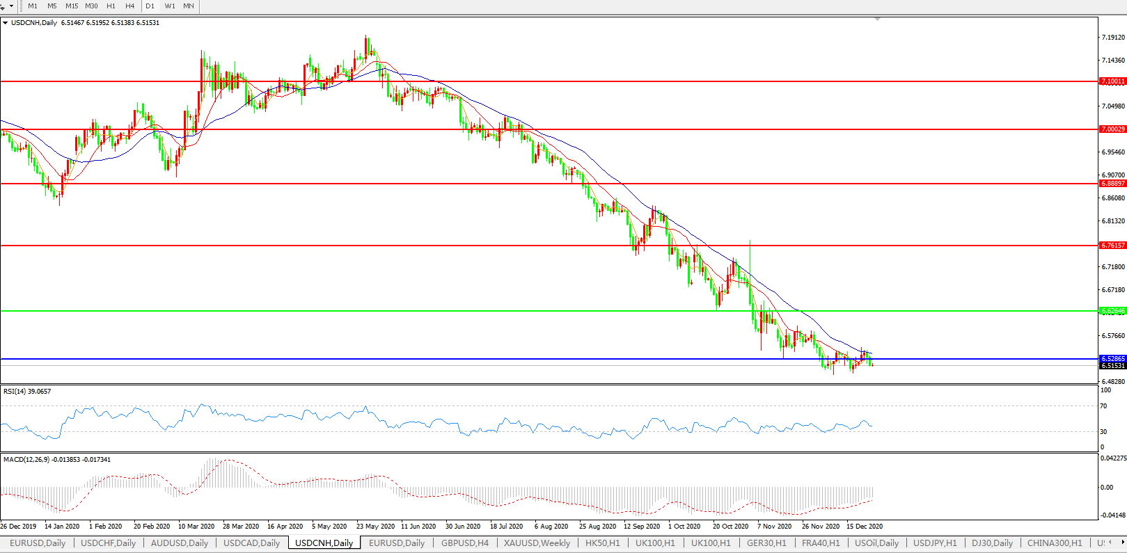 美元兑人民币USDCNH 日线图: