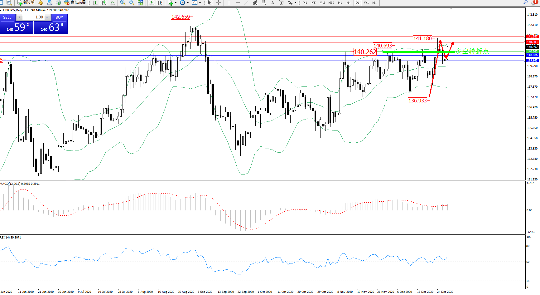 技术点评:长时间维持在布林带指标通道内持续宽幅震荡持续平移中,处于中上轨区间持续震荡后有继续上扬态势,布林带指标呈缓慢张口走势中,关注中上轨区间节点,前期高位141.180位置近在咫尺破位在即,MACD指标处于0轴线上方维持窄幅整理平移中,RSI指标处于50均衡线上方持续窄幅震荡后弱势徘徊中;