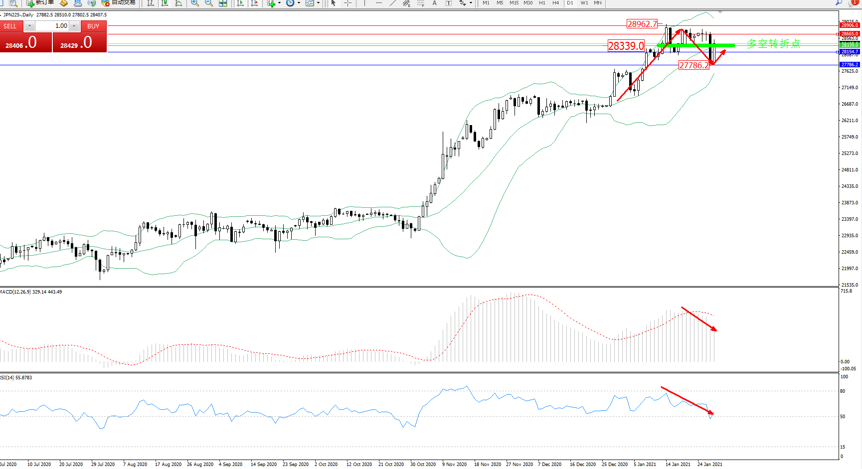 日经225指数1月28日(周四)收盘下跌456.21点,跌幅1.59%,报28179.00点。受到美元指数的影响。股市因估值过高担忧下跌,提振对美元的避险需求。市场担心对冲基金轧空、企业获利表现,加上新冠疫苗延宕,使得全球股市急升走势踩煞车,这在短期内可能持续拉抬美元。支撑美元的避险情绪是在风险资产单向上涨后的良性修正。日本内阁官房长官加藤胜信:日本首相菅义伟、拜登进行了通话,确认就疫情合作。据日本NHK电视台公布的调查结果显示,日本100家大型公司中,有48家公司赞成今年以缩减规模举办奥运会和残奥会。日本东京新增1064例新冠肺炎确诊病例。