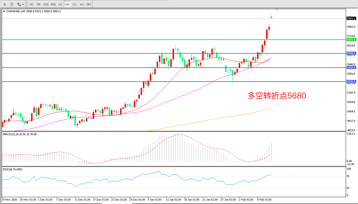 4小时图看,沪深300阳线连续拉升, 5680阻力被突破,短期表现十分强势,行情进入上行加速期,MACD红柱增加,RSI指标向上,节后延续上行概率较大。