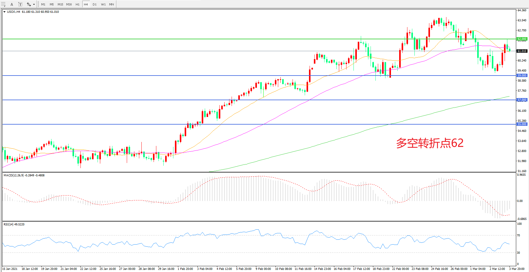 交易策略:在62.00之下看跌,目标59.00 57.00