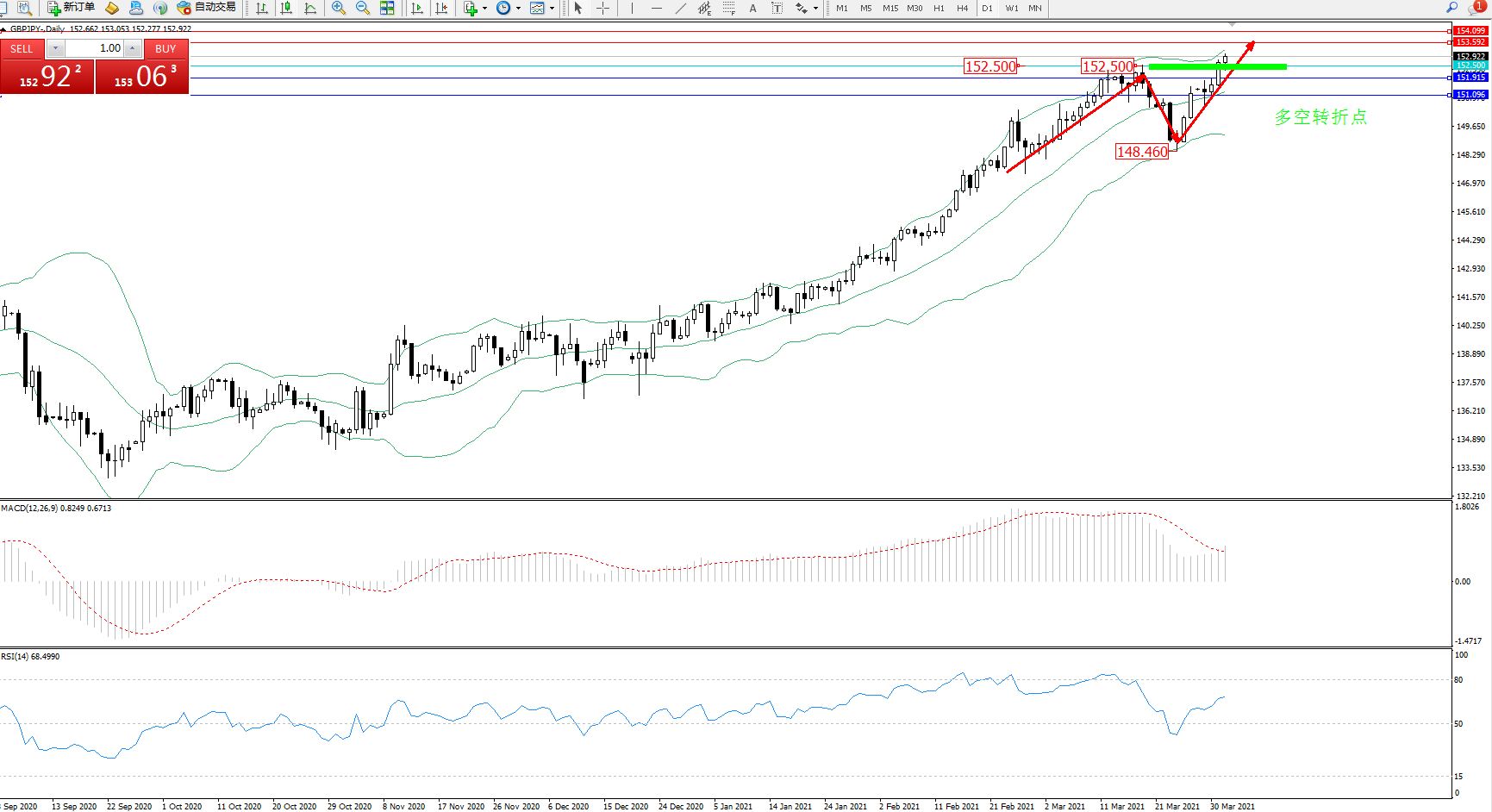 交易策略:152.500上方看涨,目标153.592、154.099