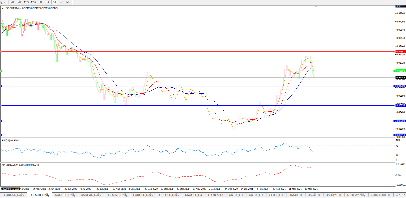 交易策略:0.9300下方看跌,目标0.9170、0.9000