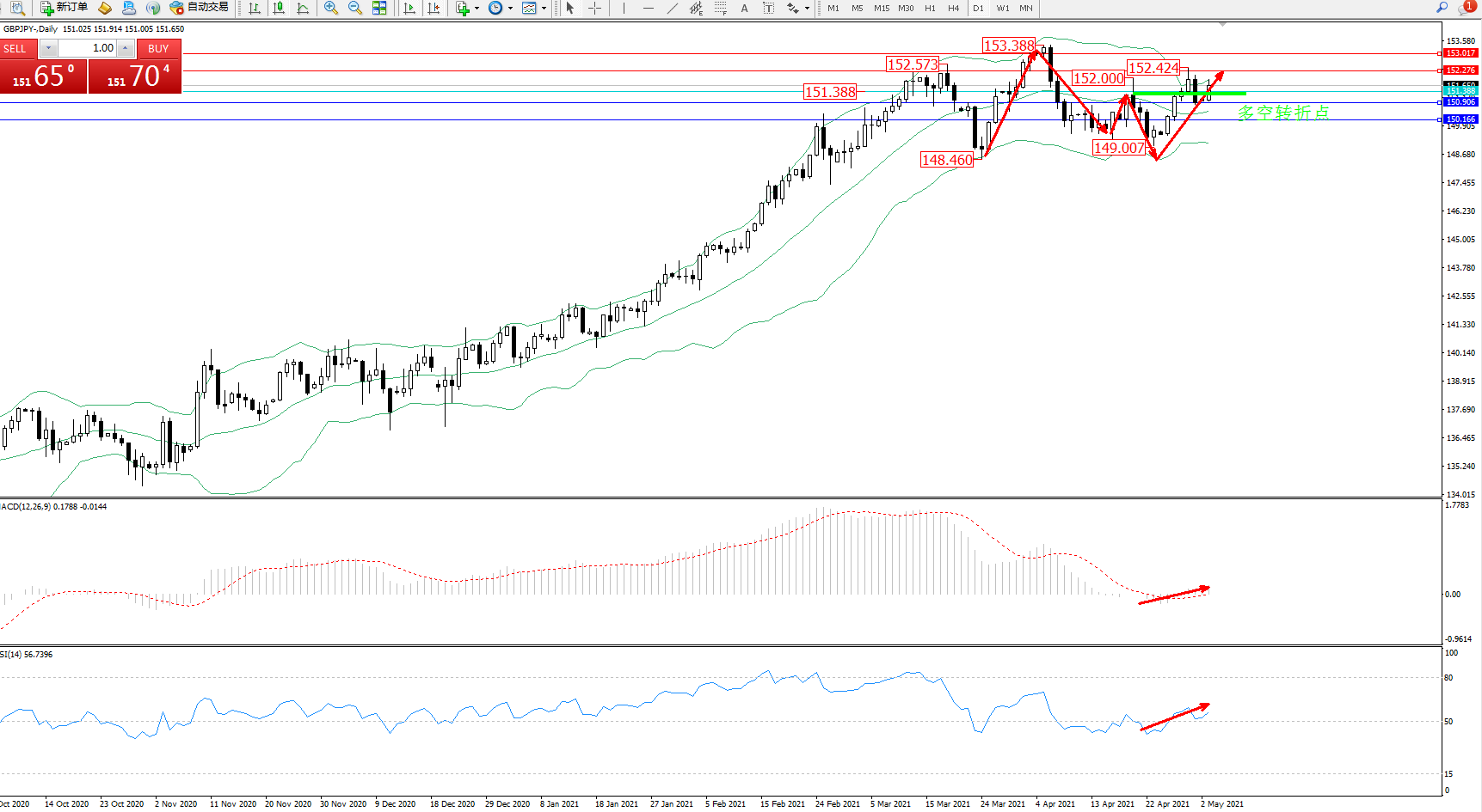 备选策略:151.388下方看跌,目标150.906、150.166