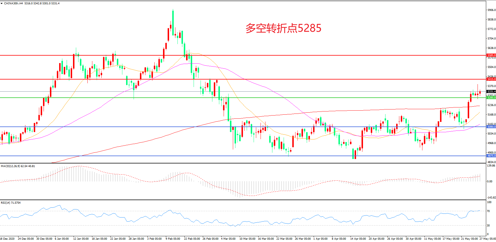 4小时图看,沪深300连续拉升后延续高位震荡,短线涨势暂缓,但上升趋势依然完好,5285成为下方支撑,MACD红柱增加,RSI指标走平,日内震荡上行概率较大。