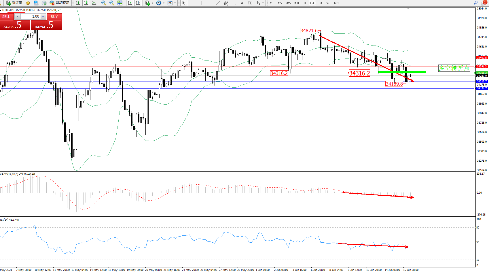 道琼斯指数DJ30——4小时K线图显示: