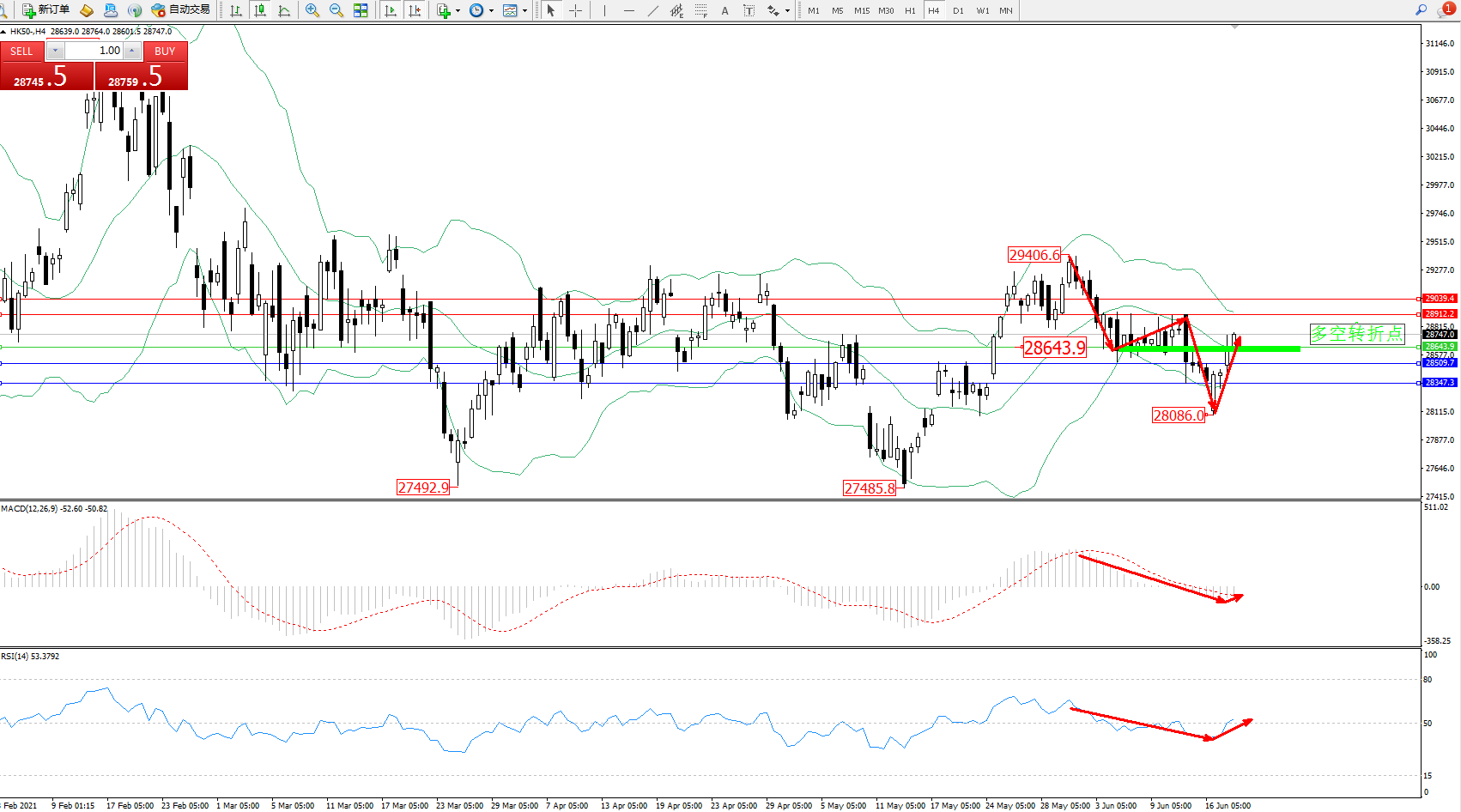 恒指HK50 ——4小时K线图显示: