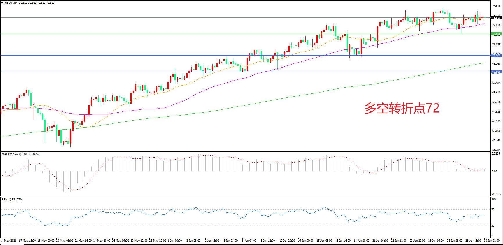 4小时图看,油价高位调整后震荡回落,上行趋势暂缓,但上升形态依然完好,55周期均线成为下方支撑,MACD红柱缩短,RSI指标走平,日内震荡上行概率较大。
