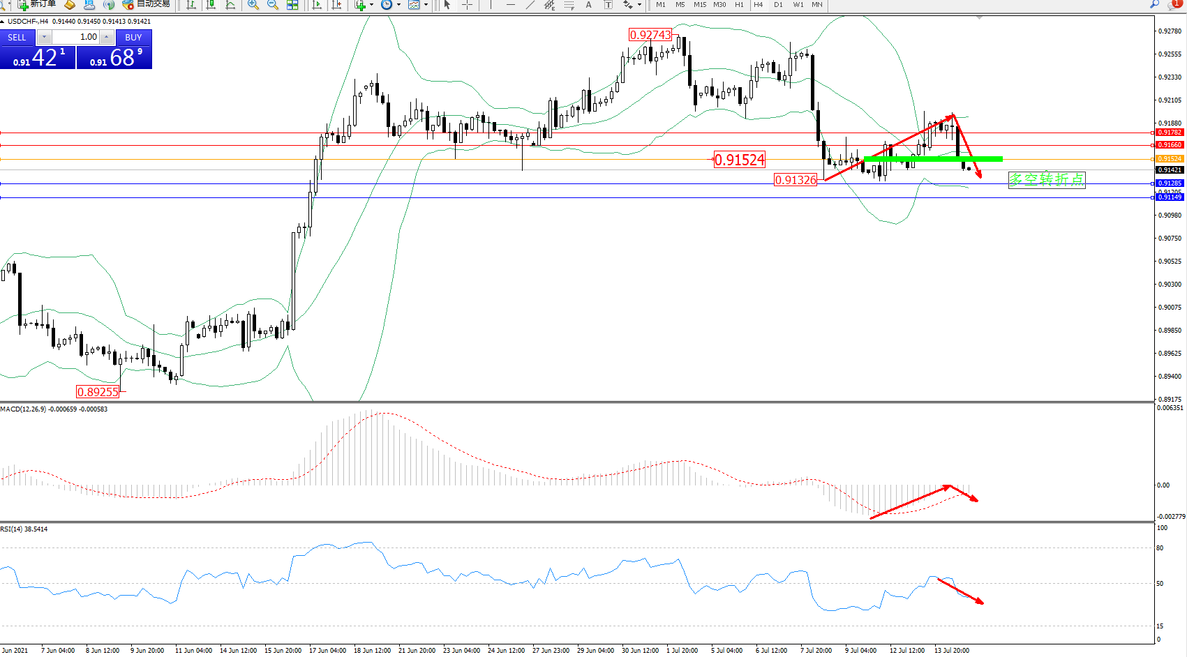 交易策略:0.91524下方看跌,目标0.91285、0.91149