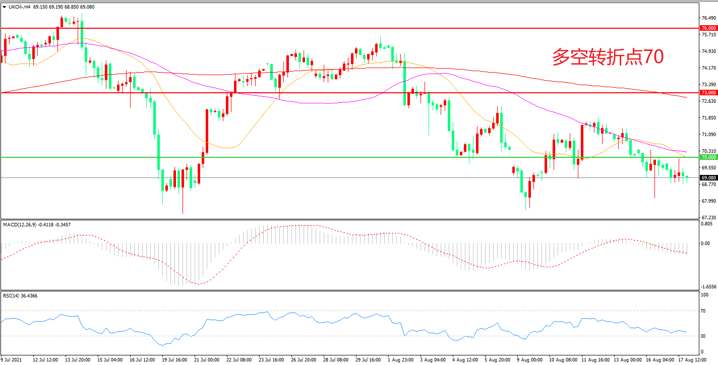4小时图看,油价短线反弹后受制于55周期均线,70成为多空分水岭,短线行情较为低迷,MACD红柱减少,RSI指标走平,油价震荡下行概率较大。
