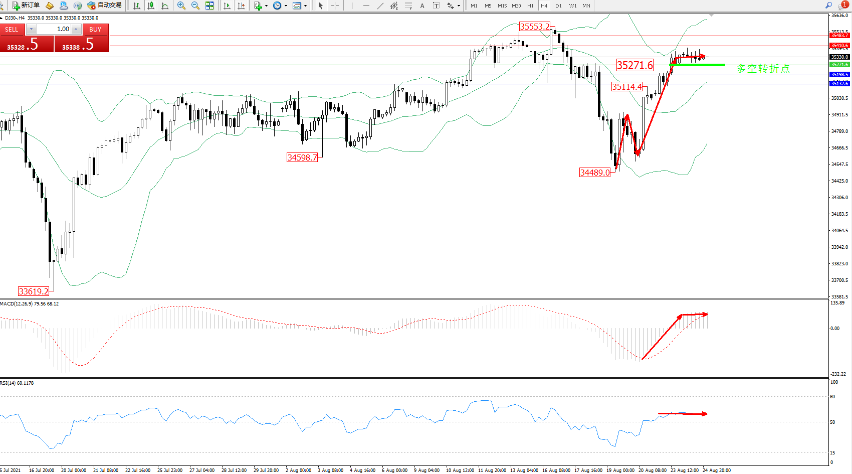 道琼斯指数DJ30——4小时K线图显示: