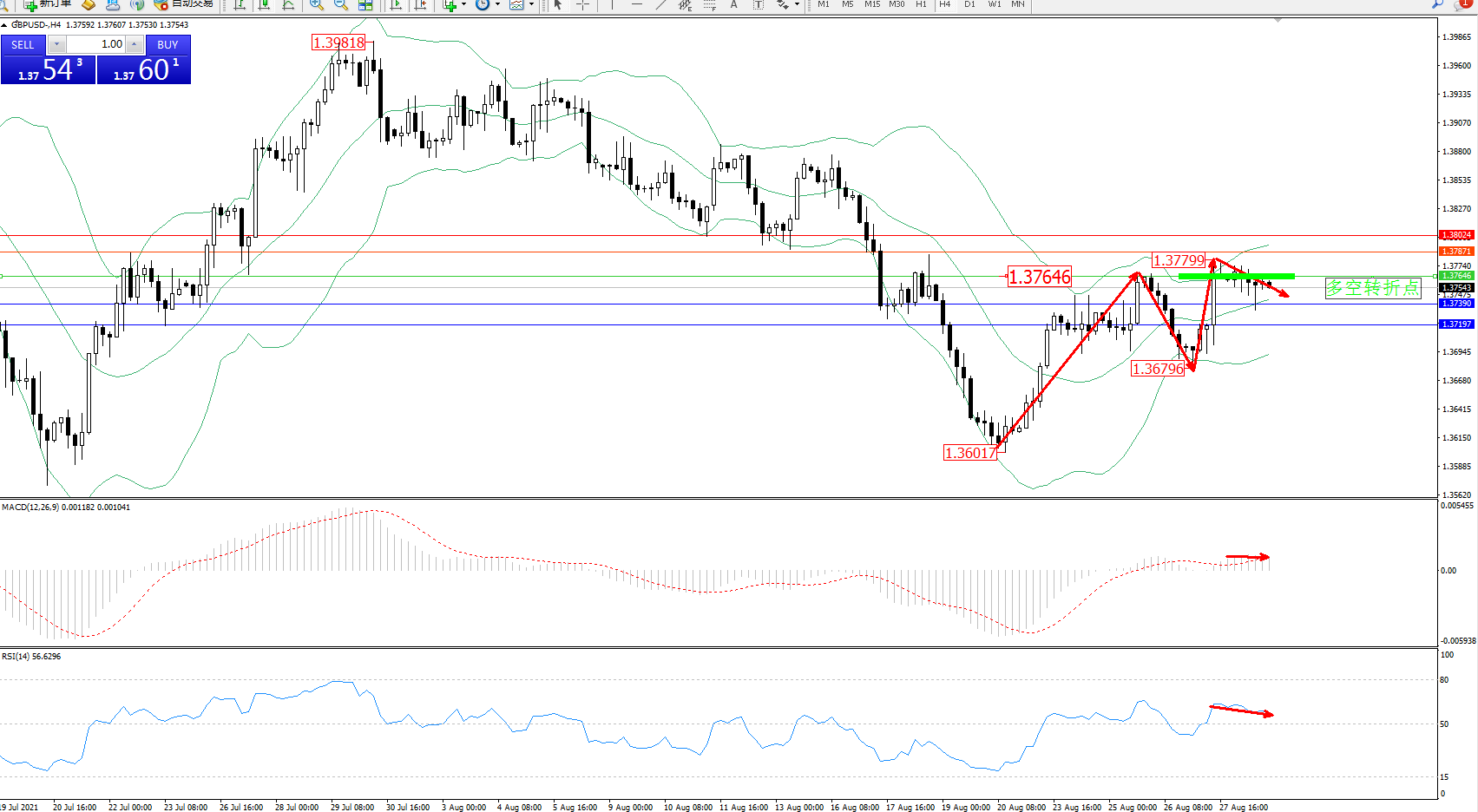 交易策略:1.37646下方看跌,目标1.37390、1.37197