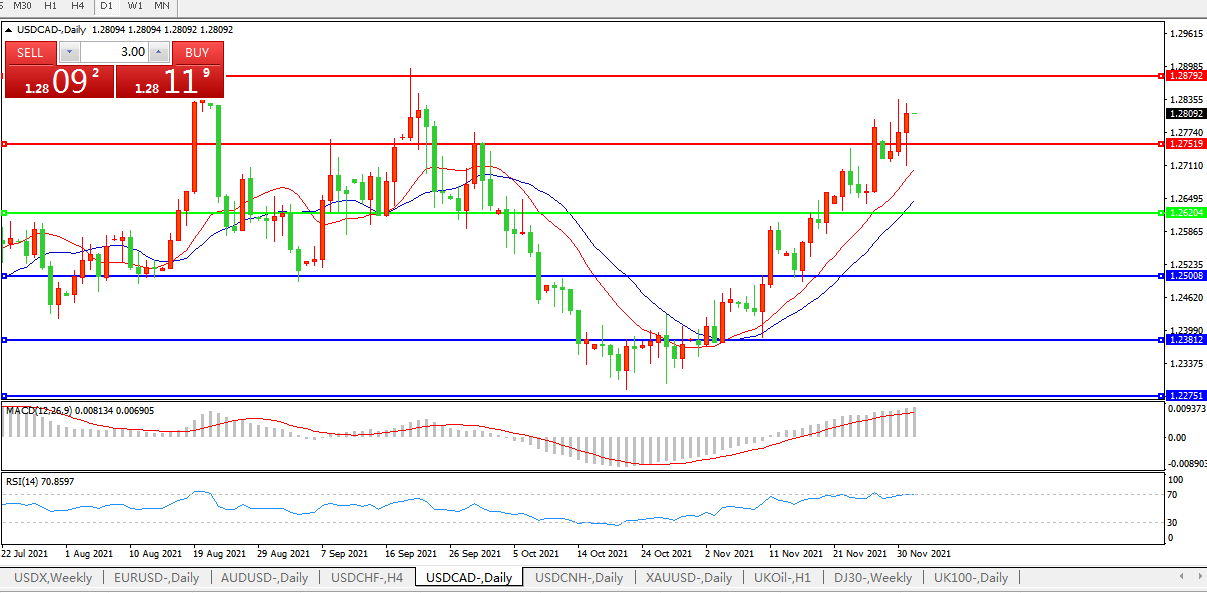 因油价逆转涨势;美元兑加元上涨0.2%至1.2808加元,因油价伴随市场对omicron的担忧而大跌;关注11月30日高点1.2837;加元兑日元跌破200日移动均线,触及近2个月低点。