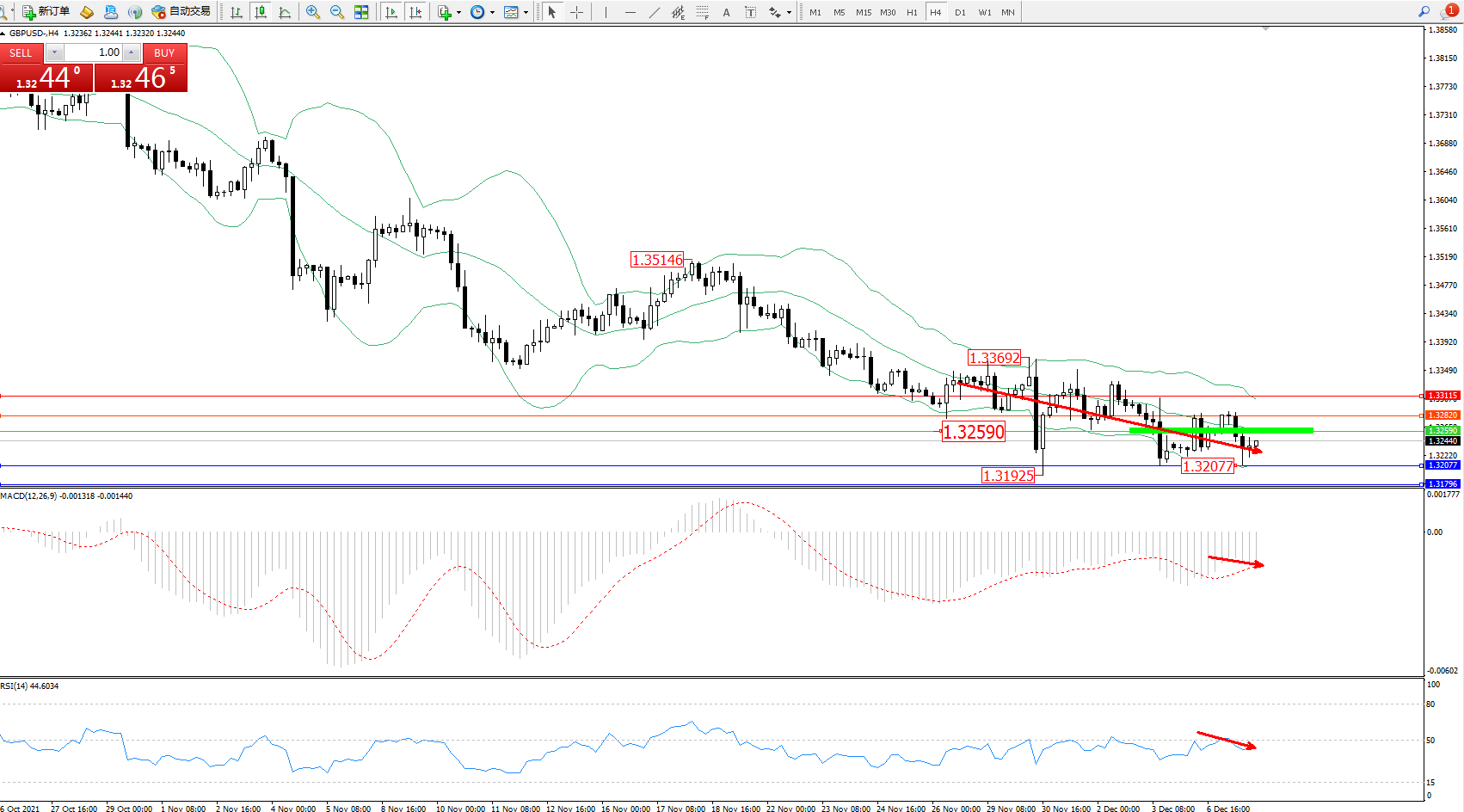 交易策略:1.32590下方看跌,目标1.32077、1.31796