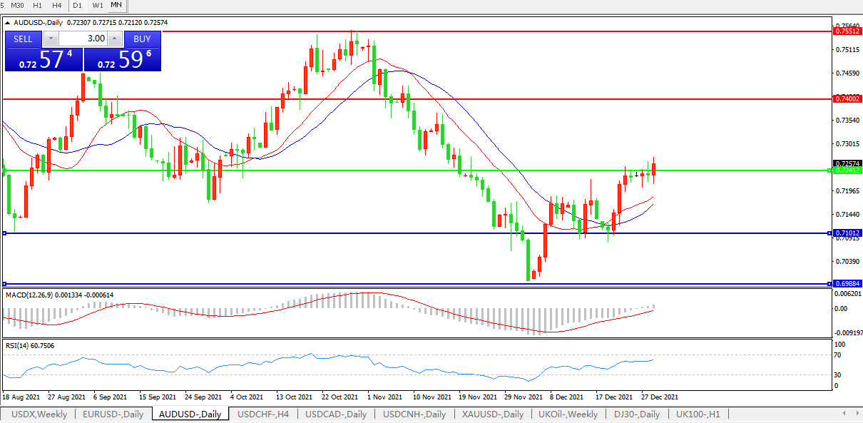 交易策略:0.7240上方看涨,目标0.7400、0.7550