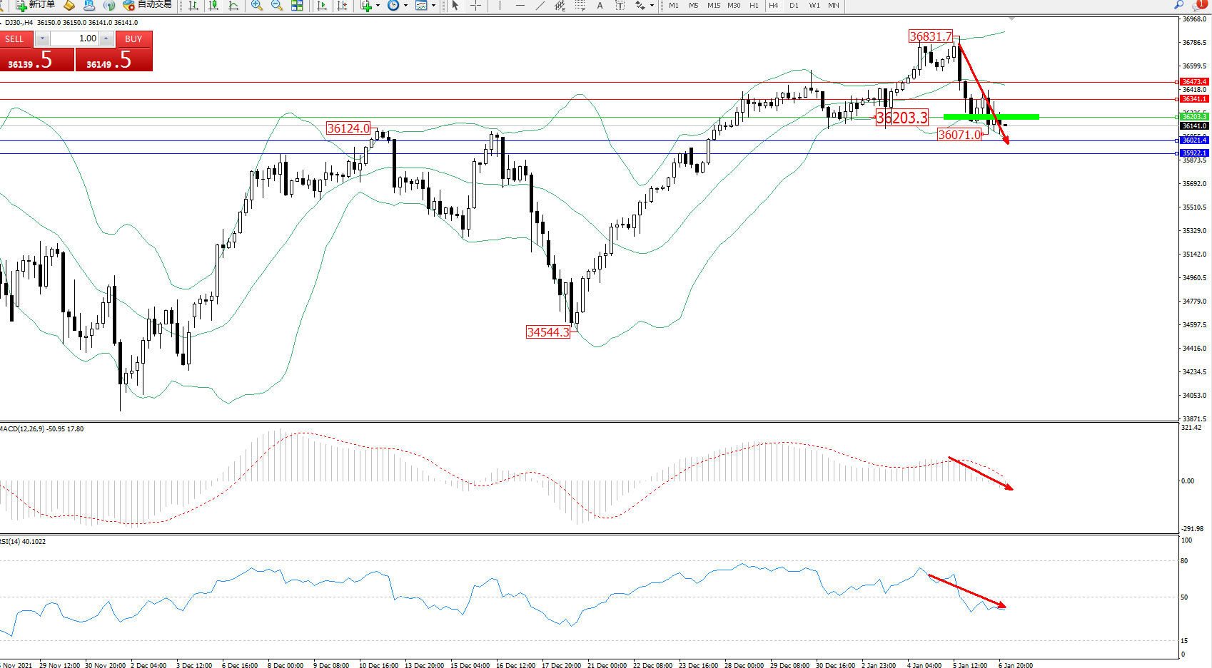 道琼斯指数DJ30——4小时K线图显示: