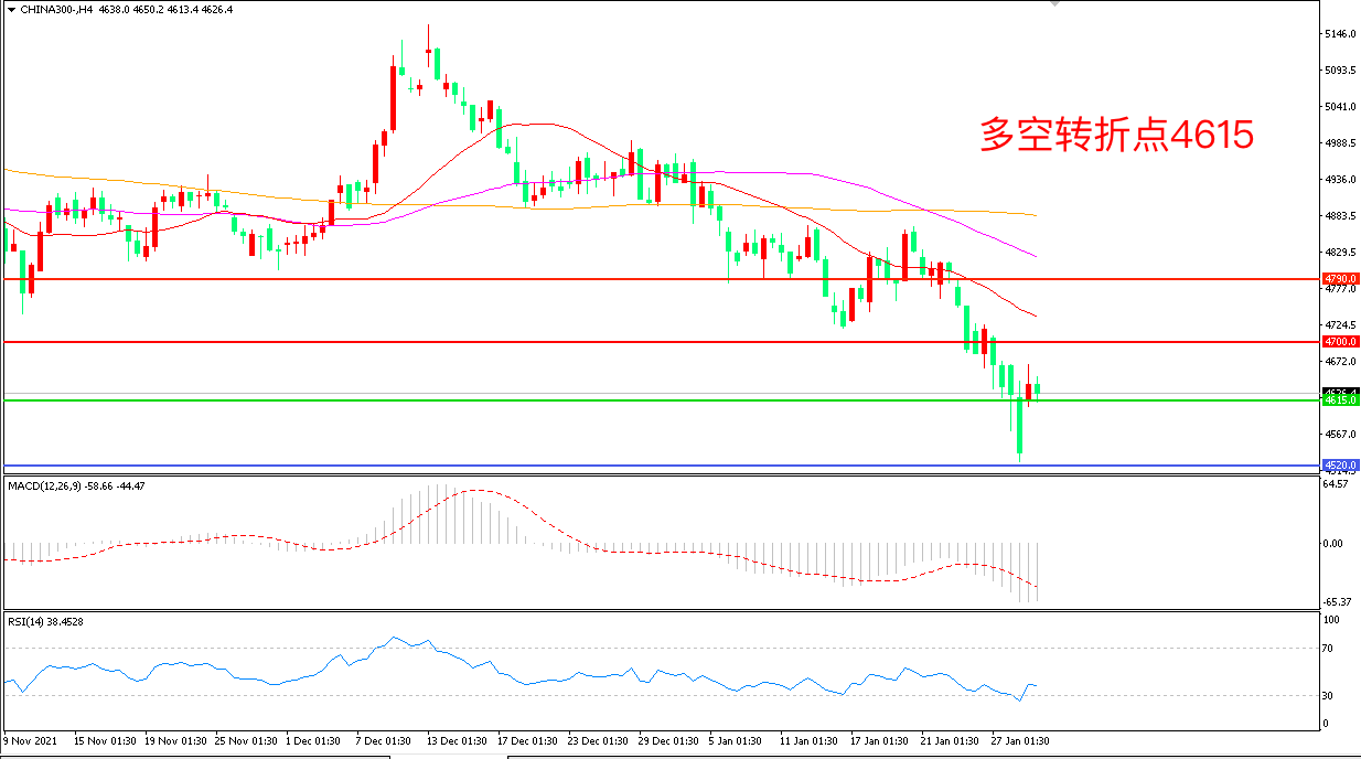 4小时图看,沪深300高开高走,短期看有企稳迹象,但均线系统仍呈空头排列, MACD绿柱缩短,RSI指标走平,日内或有小幅反弹。