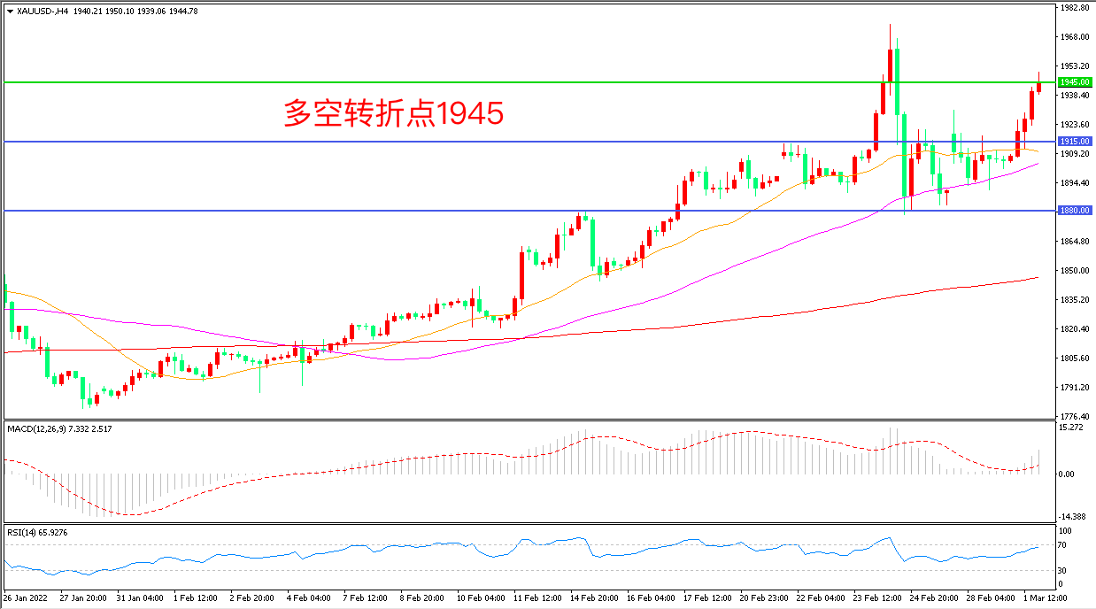 周二(3月1日),随着乌克兰冲突加剧,欧美针对俄罗斯的制裁力度加大,全球市场出现新一轮的避险情绪,现货黄金“扶摇直上”,收报1944.78美元/盎司。俄罗斯国防部长绍伊古表示,俄军将继续在乌克兰开展特别军事行动,直至实现既定目标,地缘冲突加剧导致市场情绪陷入恐慌,各经济体正面临几十年来最高的通胀,这给各国央行增加了加息的压力,重点关注鲍威尔的国会讲话。