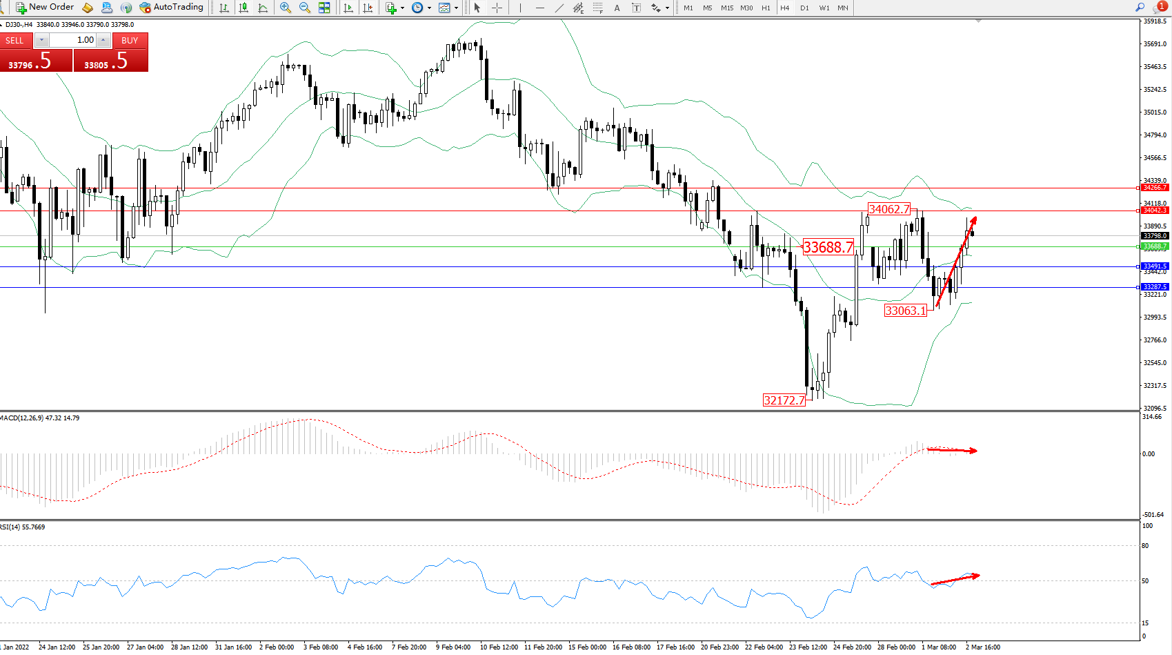 交易策略:33688上方看涨,目标4042、34266