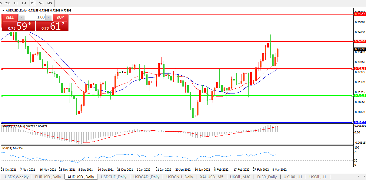 技术面简析:日图均线呈多头排列,汇价小幅上行,MACD运行于0轴上且量能小幅缩量,RSI回落后走升,预计汇价大概率将在回落整理后进一步上行。