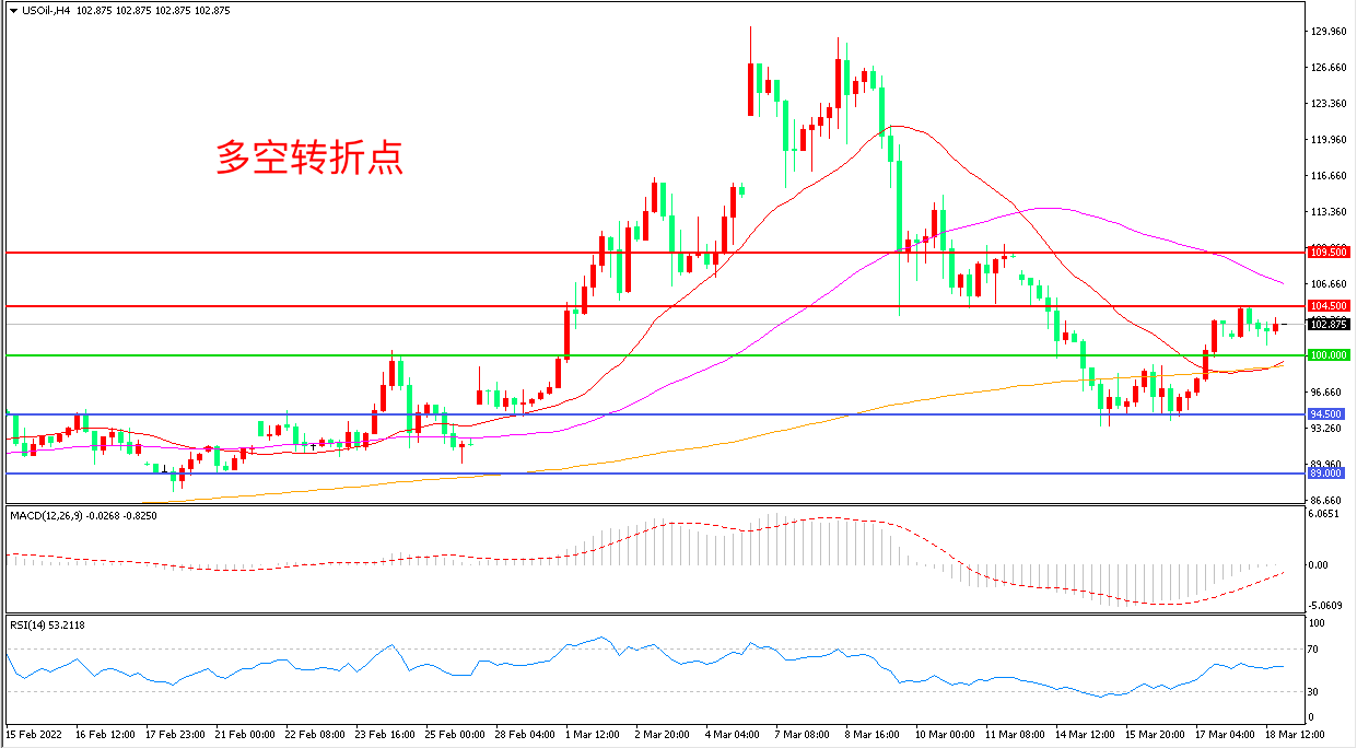 4小时图看,油价突破100美元后区间震荡形态明显,均线系统走平,MACD绿柱缩短,RSI指标走平,日内震荡上行概率较大。