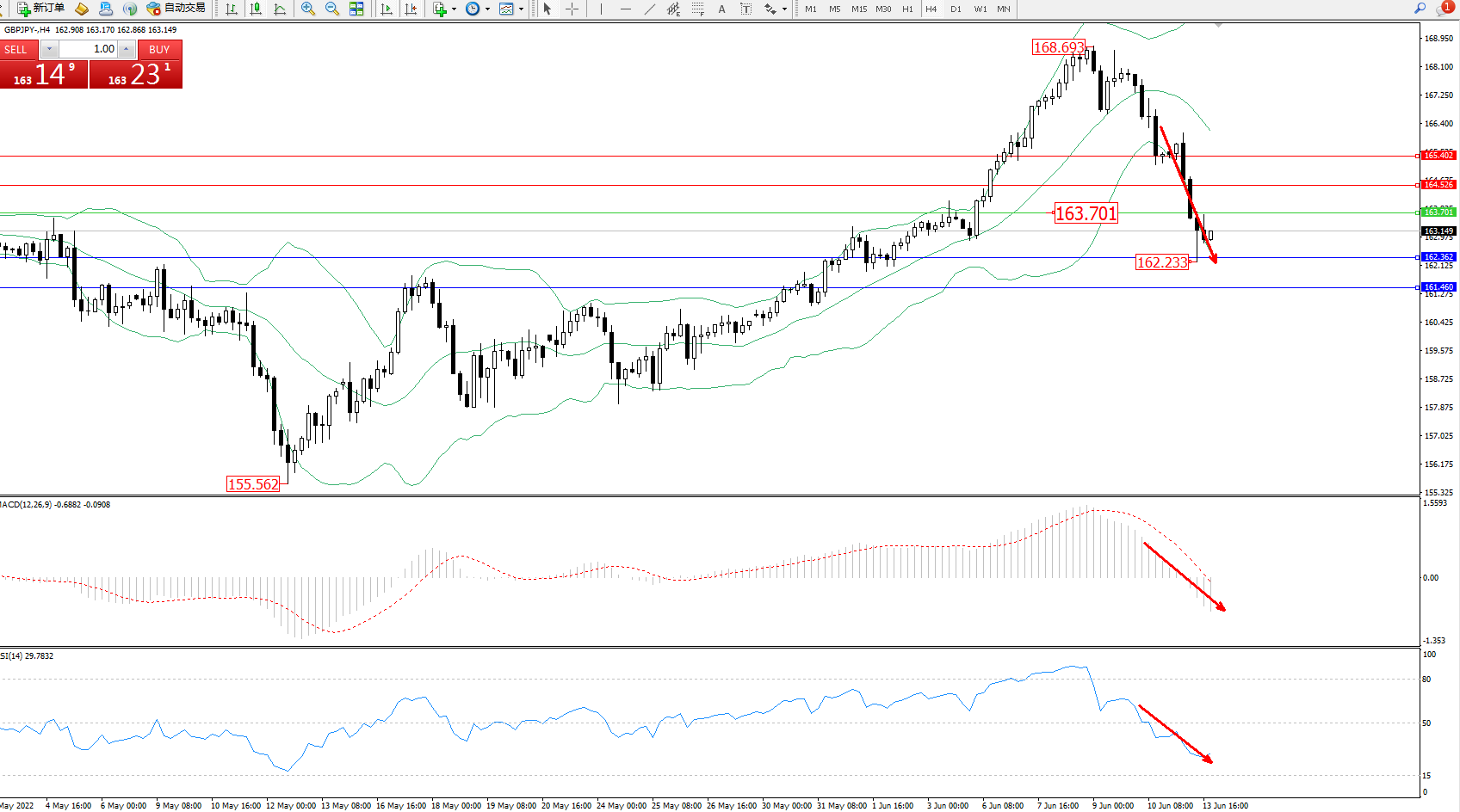 交易策略:163.701下方看跌,目标 162.362、161.460