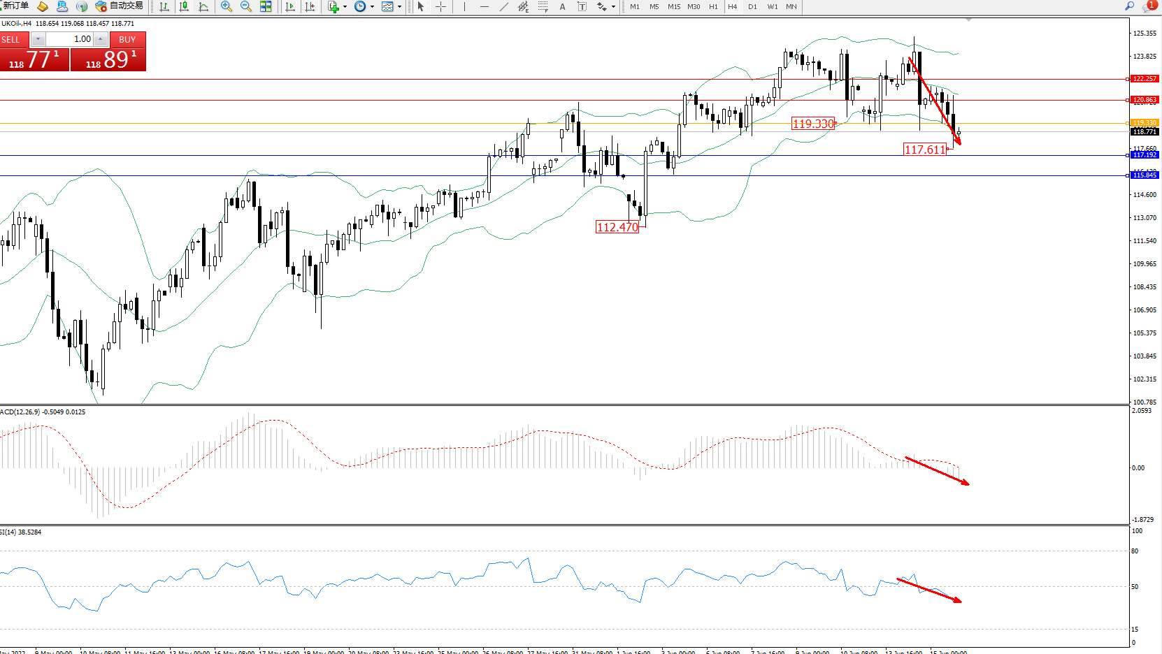 交易策略:在119.330下方看跌,目标117.192、115.845