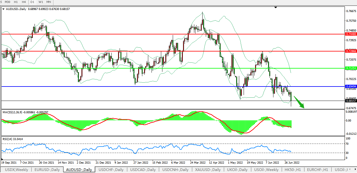 日线图看:短期汇价延下轨持续下行,汇价有突破下行迹象,布林带指标呈收敛走势并逐步下行,MACD运行于0轴下方且量能持续放量,RSI迅速走弱,预计汇价大概率将在反弹后进一步下行。