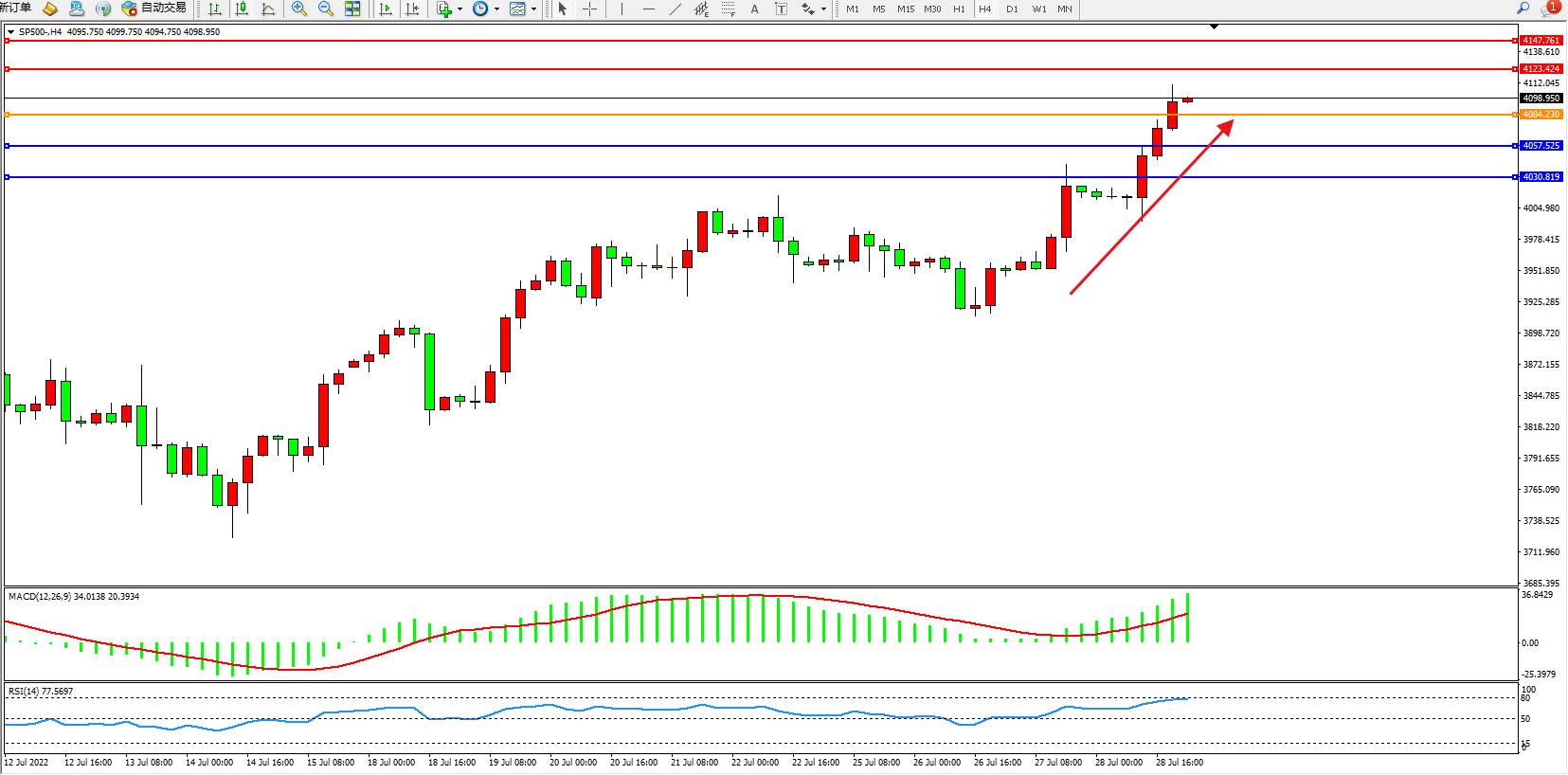 标普SP500——4小时K线图显示: