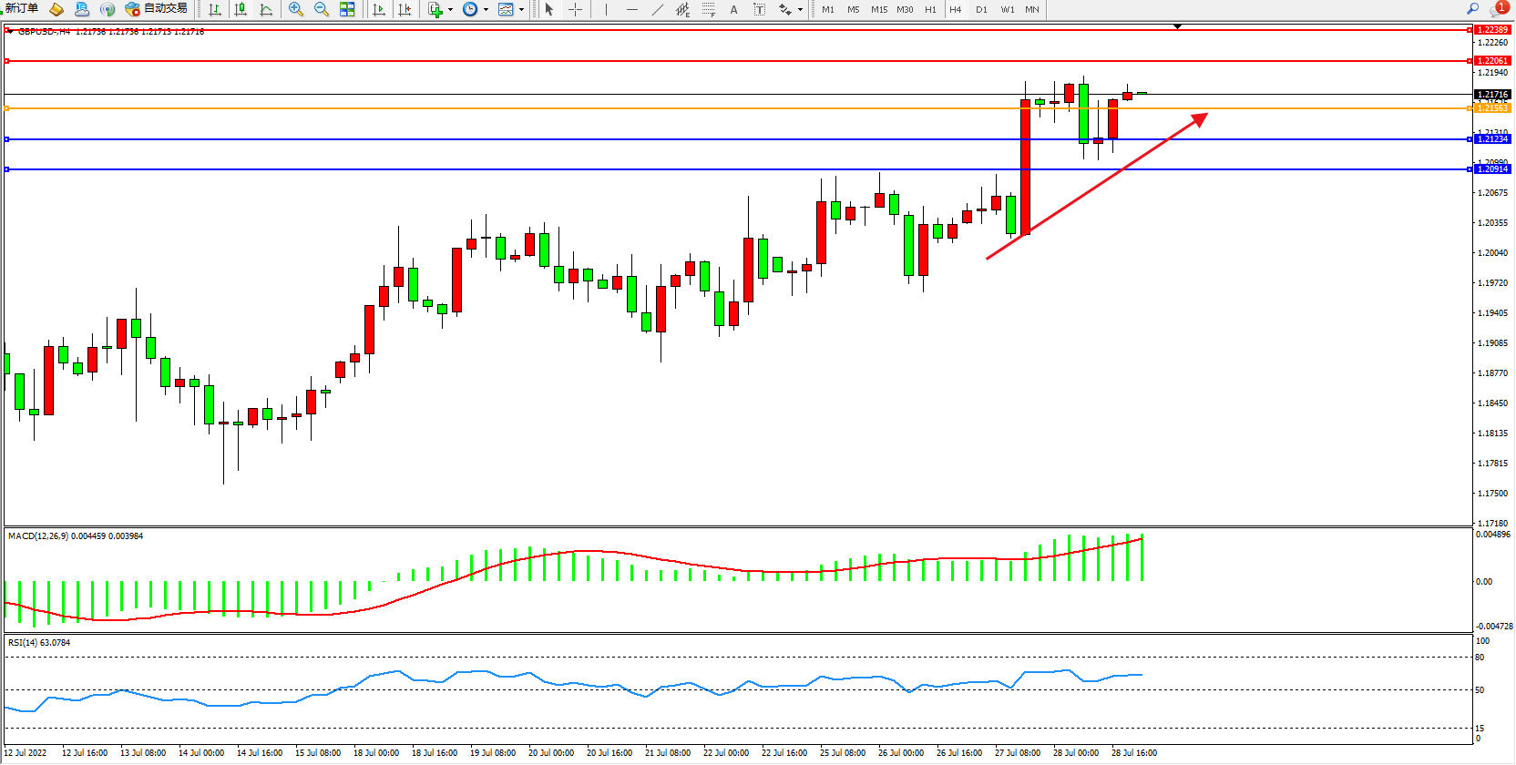 交易策略:1.21563上方看涨,目标1.22061、1.22389