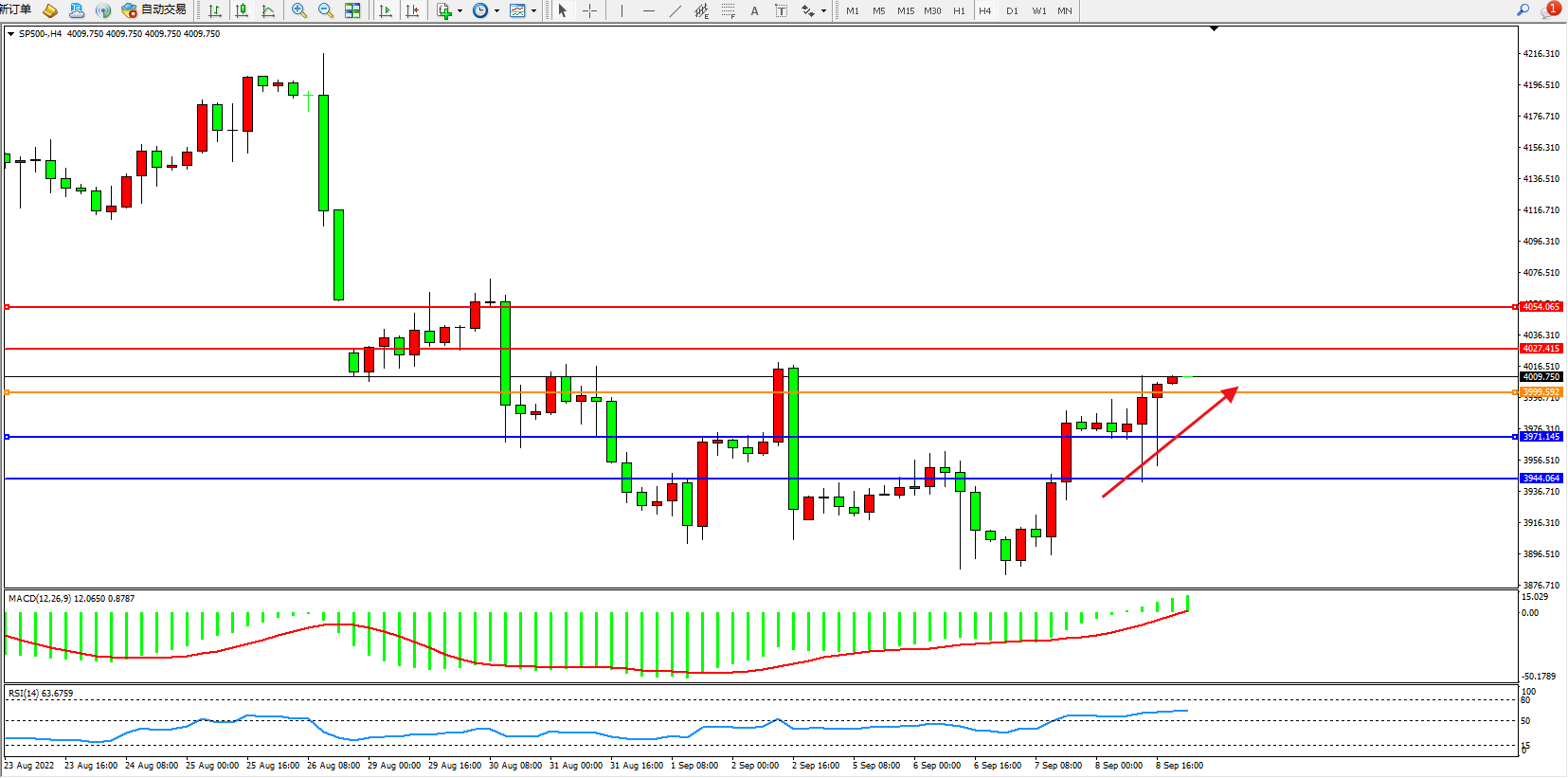 标普SP500——4小时K线图显示: