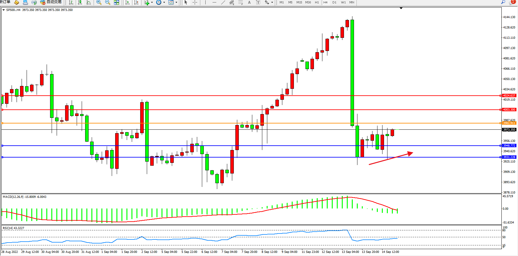 标普SP500——4小时K线图显示:
