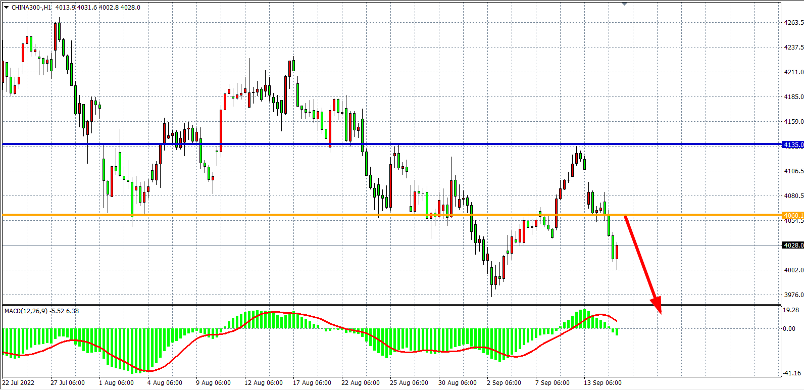 1小时图看,沪深300跌破4060支撑,MACD于零轴之下开始放量,显示行情回归跌势,目前4060的强支撑已变为阻力位,日内在该位之下看回调为主,下方支撑3975-3935