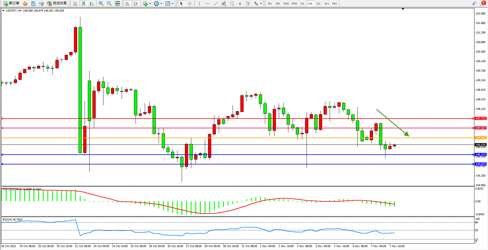 交易策略:146.910下方看跌,目标146.215、146.819