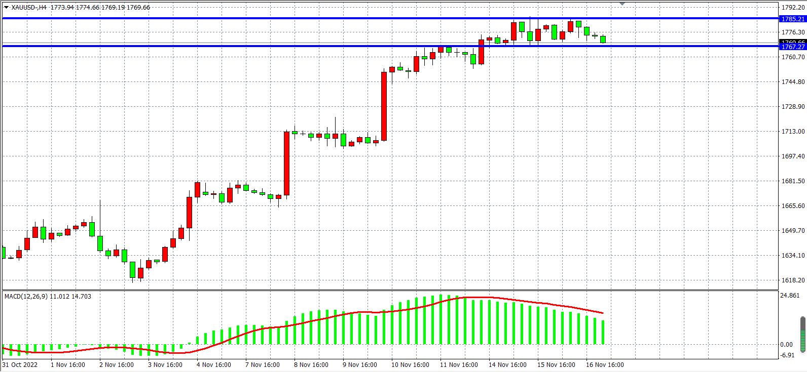 周四(11月17日)美国10月零售销售月率录得1.3%,为2022年2月以来最大增幅。数据令美联储转鸽的希望消退,同时波兰导弹爆炸事件降温,市场避险需求下降,现货黄金跌离三个月高位,盘中下逼1770美元关口,最终收跌0.26%。当前多位美联储官员再度讲话支持继续加息,行情短期内有转向可能,需留意金价会否进一步摆脱高位回落。