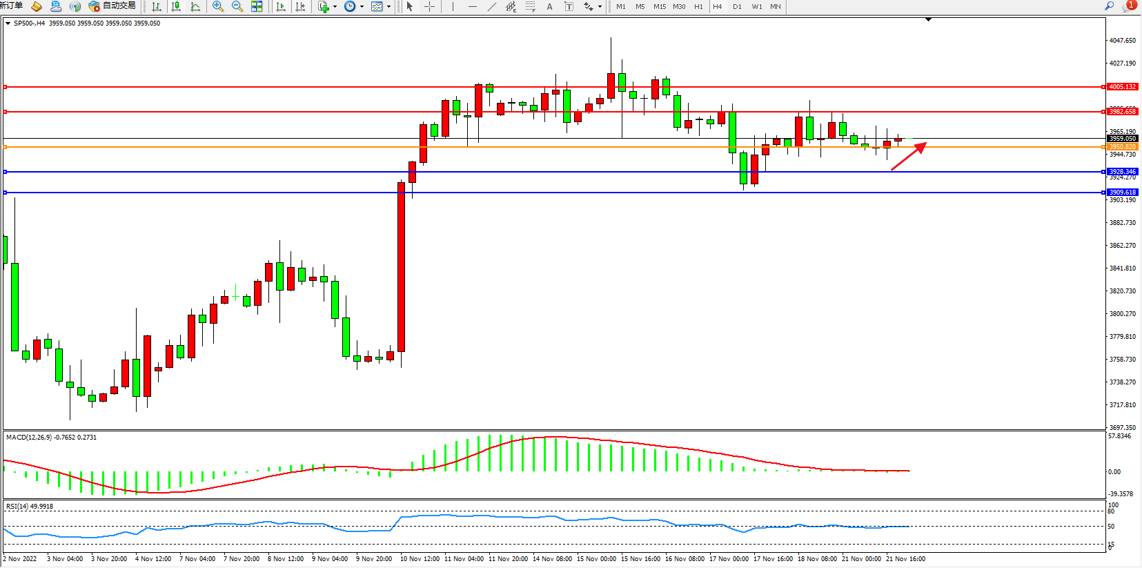 标普SP500——4小时K线图显示:
