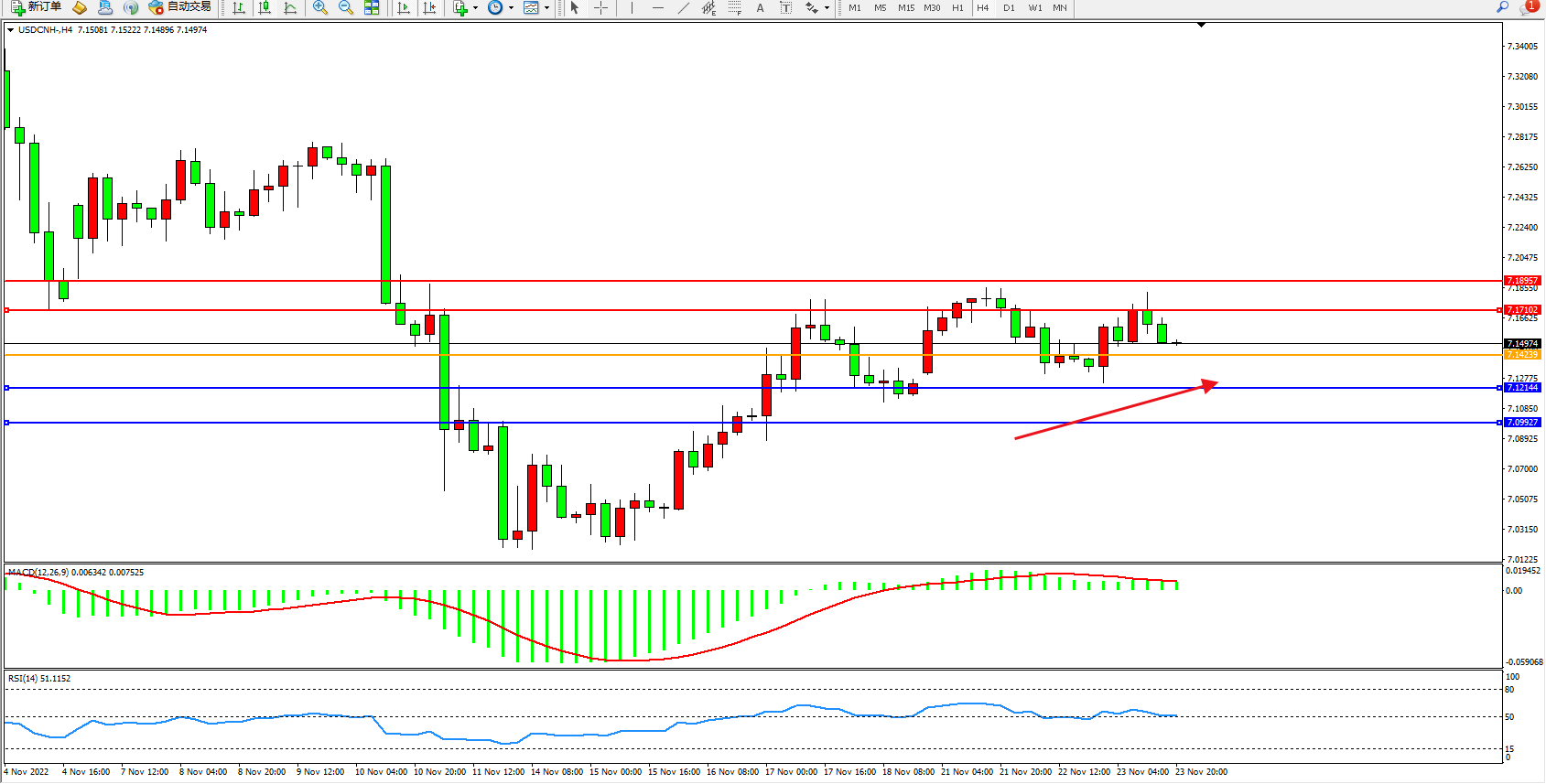 交易策略:7.14239上方看涨,目标7.17102、7.18957