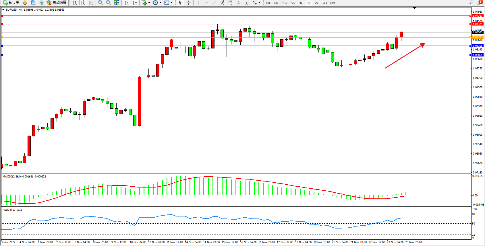 欧元美元EURUSD—4小时K线图显示: