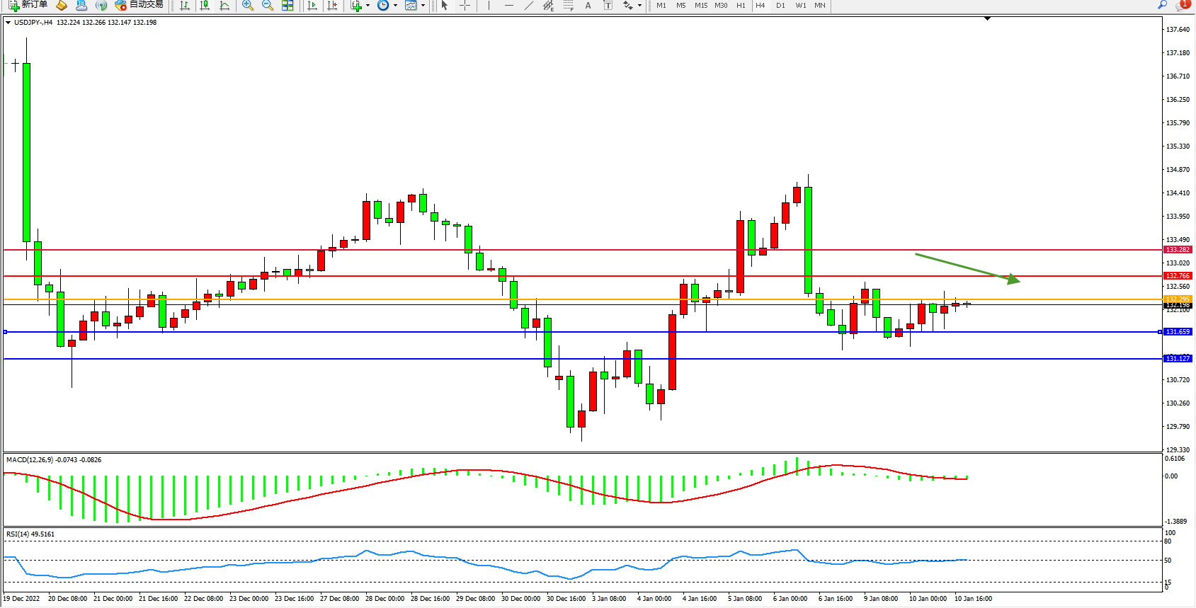 备选策略:132.295上方看涨,目标132.766、133.282