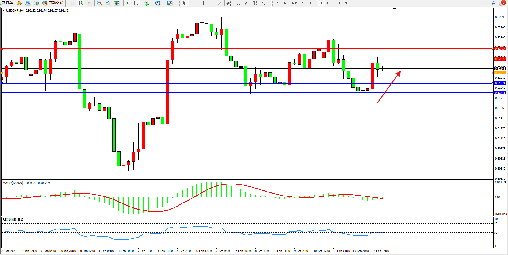 美元瑞郎USDCHF——4小时K线图显示: