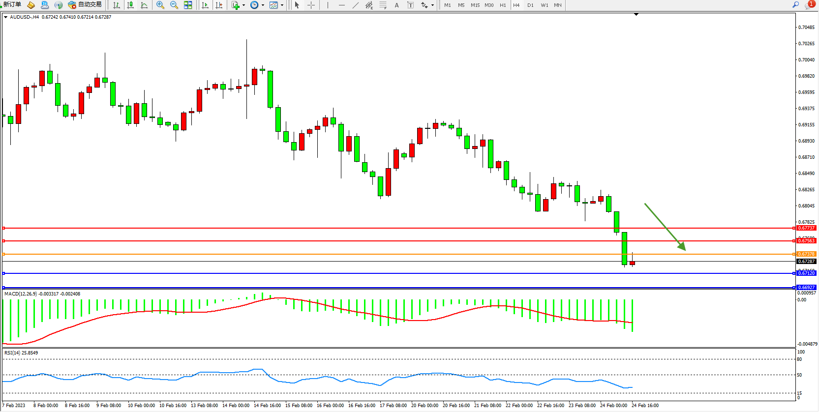 交易策略:0.67378下方看跌,目标0.67120、0.66927