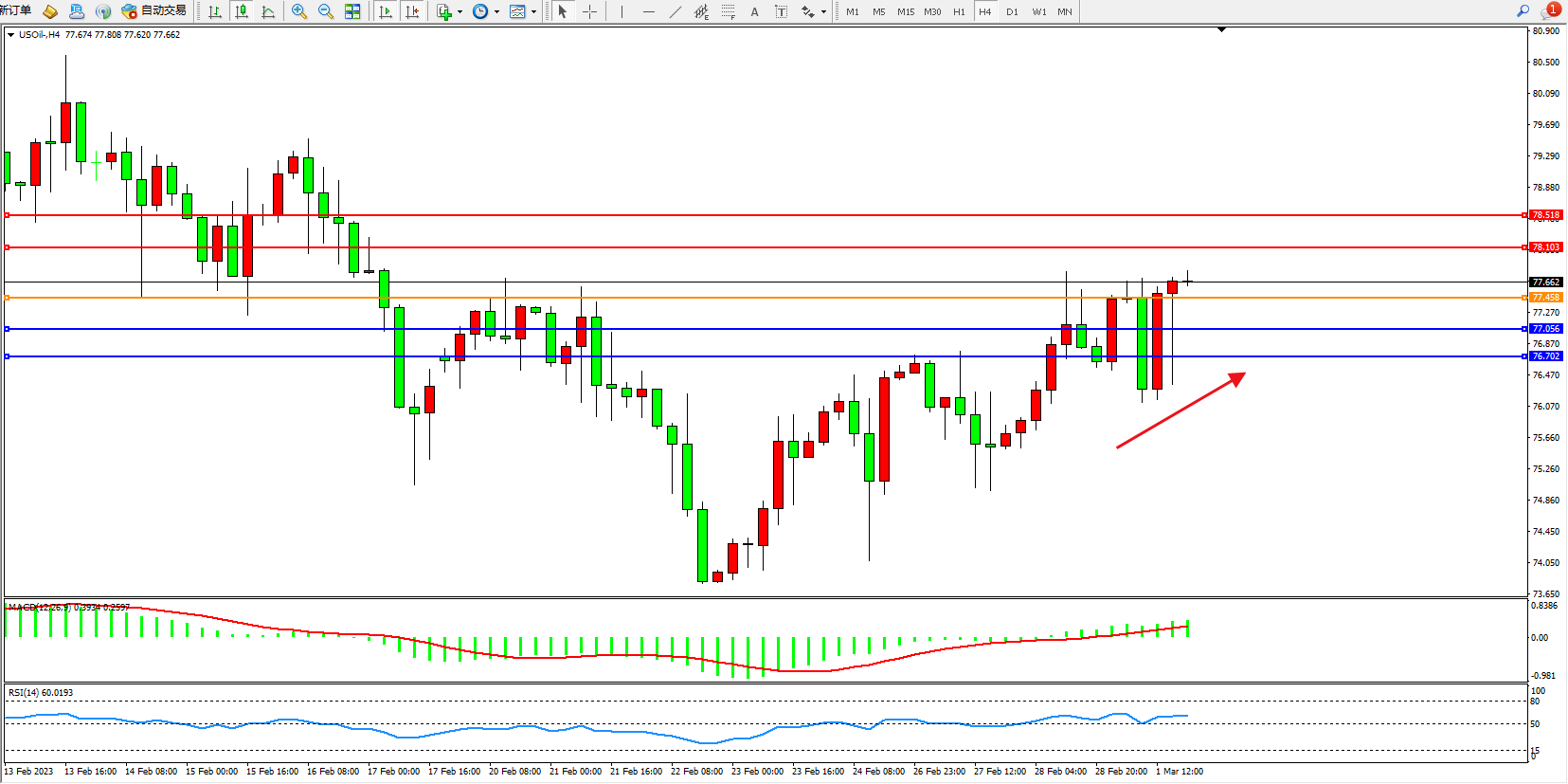 交易策略:77.458上方看涨,目标78.103、78.518