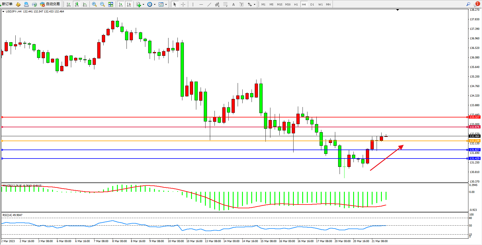 交易策略:132.239上方看涨,目标132.876 133.327