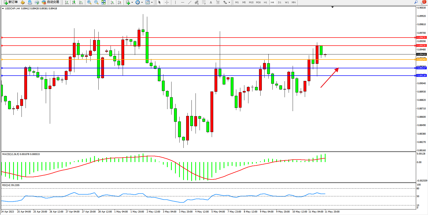 美元瑞郎USDCHF——4小时K线图显示: