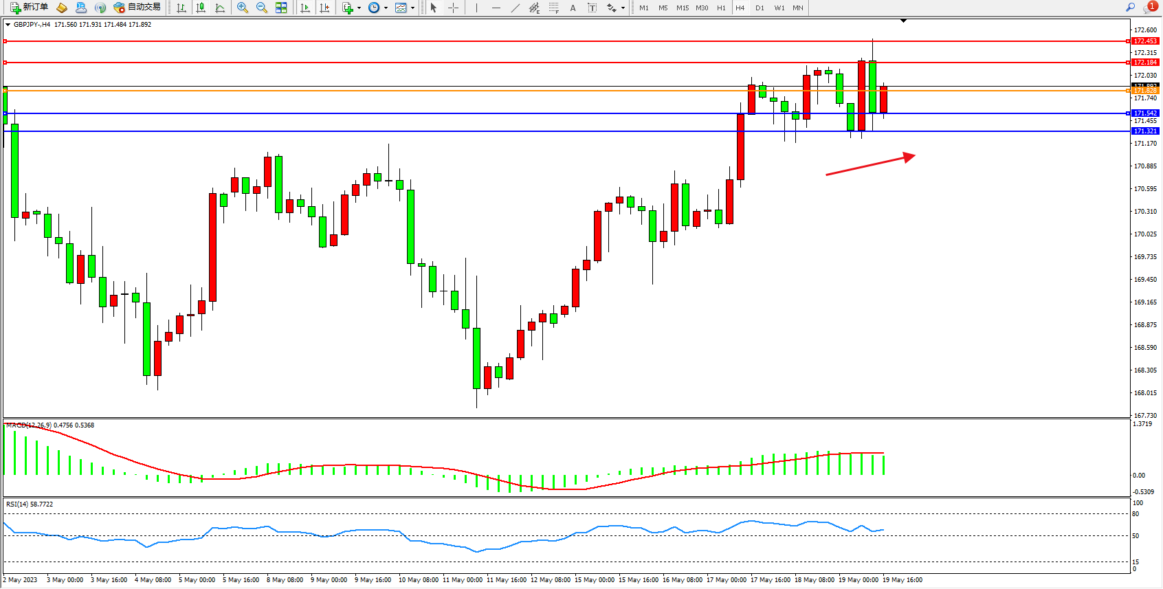 交易策略:171.828上方看涨,目标172.184  172.453