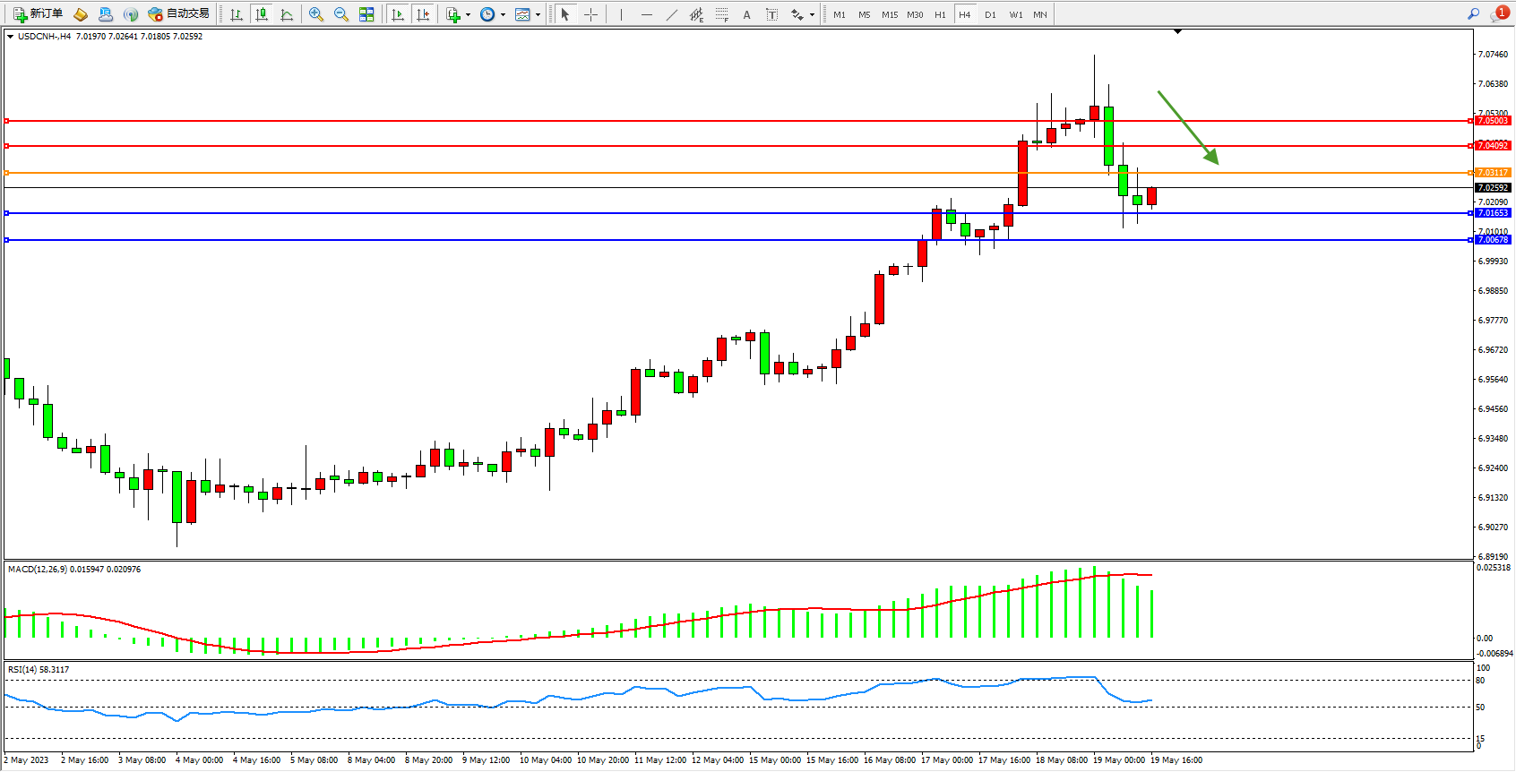 交易策略:7.03117下方看跌,目标7.01653  7.00678