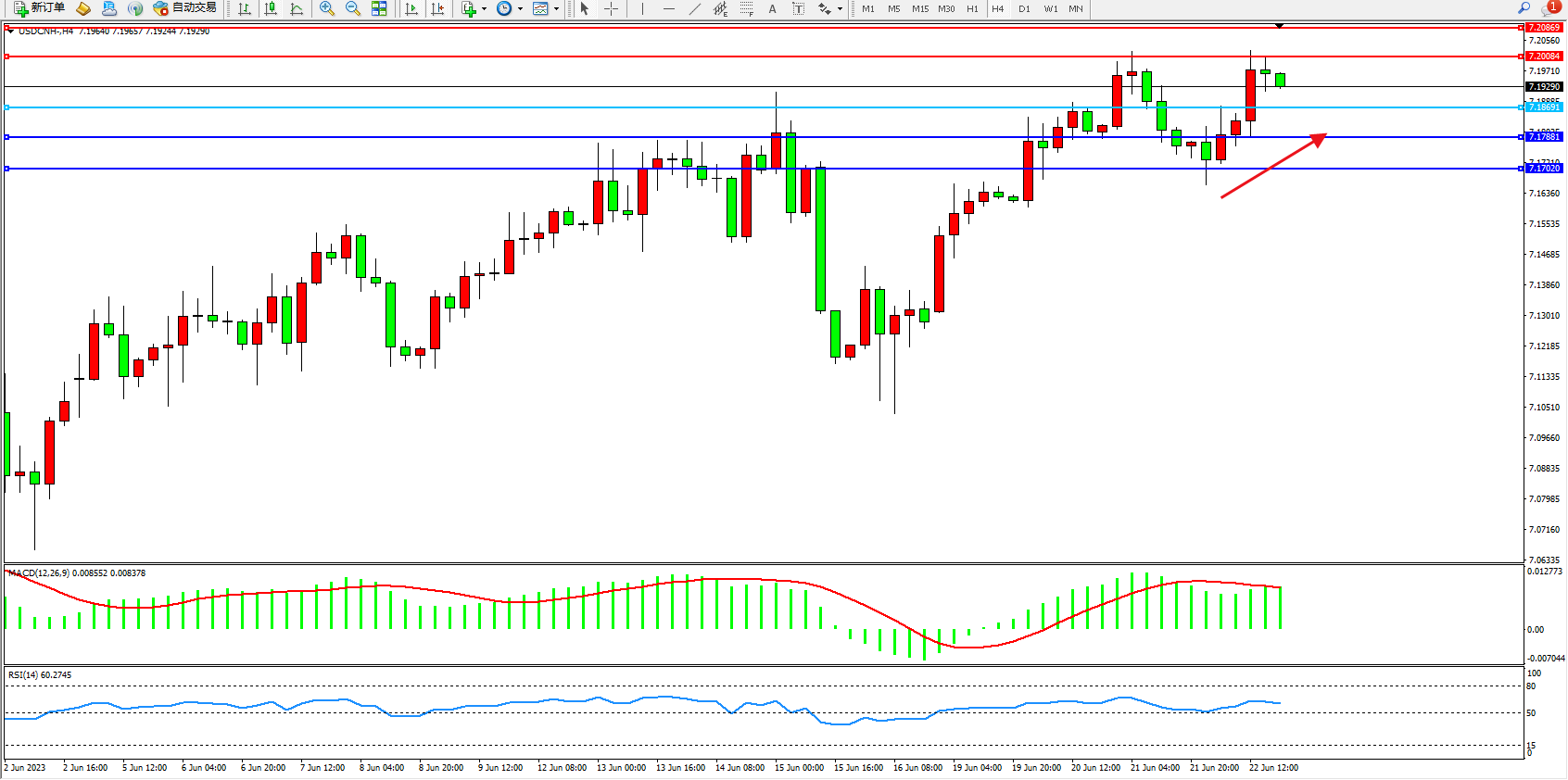 交易策略:7.18691上方看涨,目标7.20084  7.20669