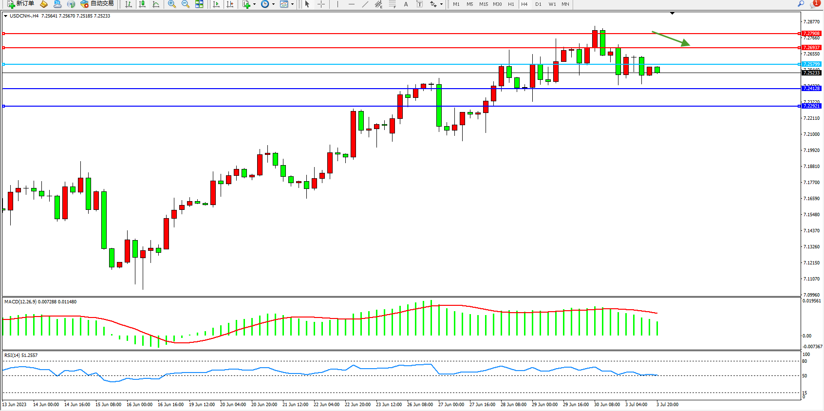美元人民币USDCNH——4小时K线图显示: